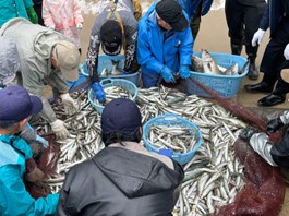 今回のイベントは、能登半島地震により住み慣れた地域を離れざるをえなくなった氷見市新道地区の住民を対象に実施されました。まずは市内の島尾海水浴場で、伝統的な地引網漁を体験。地元の漁師さんの指導のもと、子どもから大人まで力を合わせて大きな網を陸に引き上げました。この日は特に大漁で、カマス、キス、クロダイ、カワハギ、スズキ、サゴシなど、多彩な魚が次々と水揚げされました。